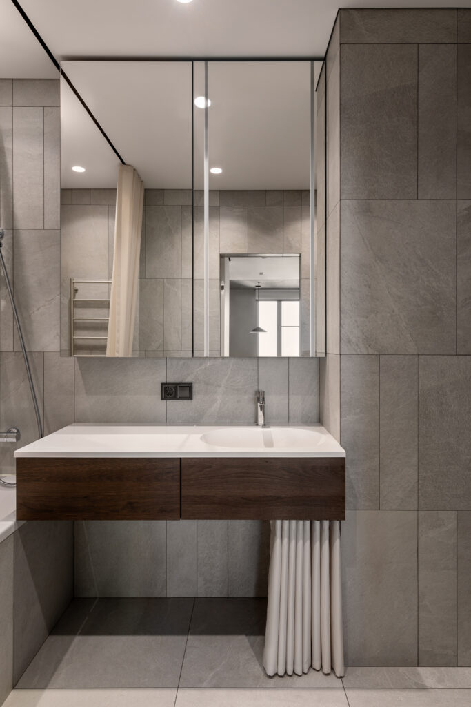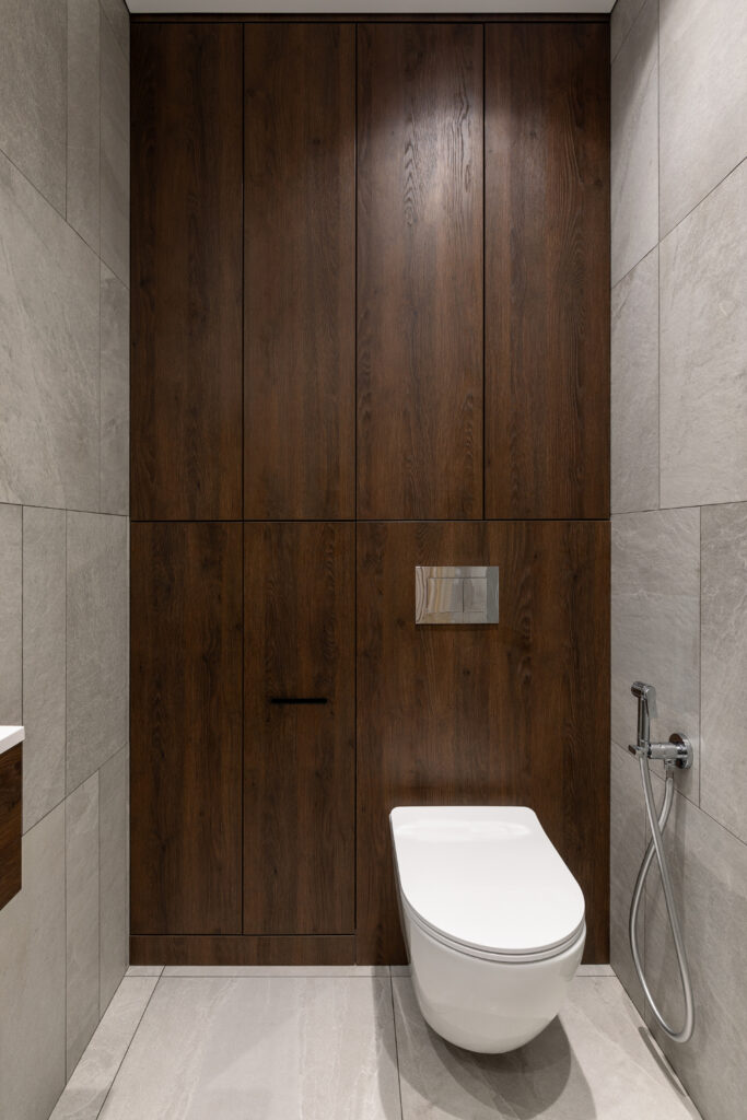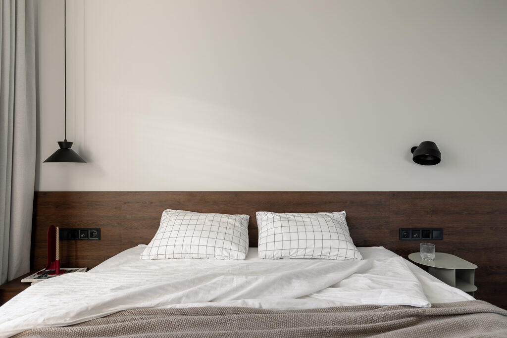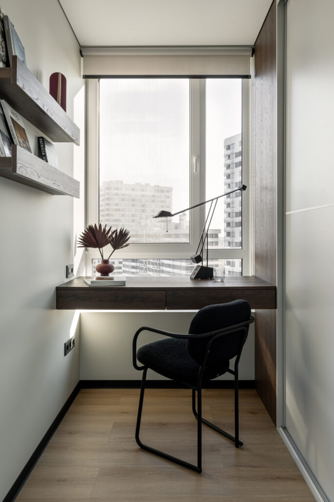 Особливу увагу приділили спальні, де всі меблі — включно з ліжком, шафами та робочим столом — виконані з одного матеріалу, що створює єдину візуальну мову простору. Ліжко оснащене підйомним механізмом, що відкриває доступ до простору для зберігання — зручне рішення для організації постільної білизни, ковдр чи сезонного текстилю.