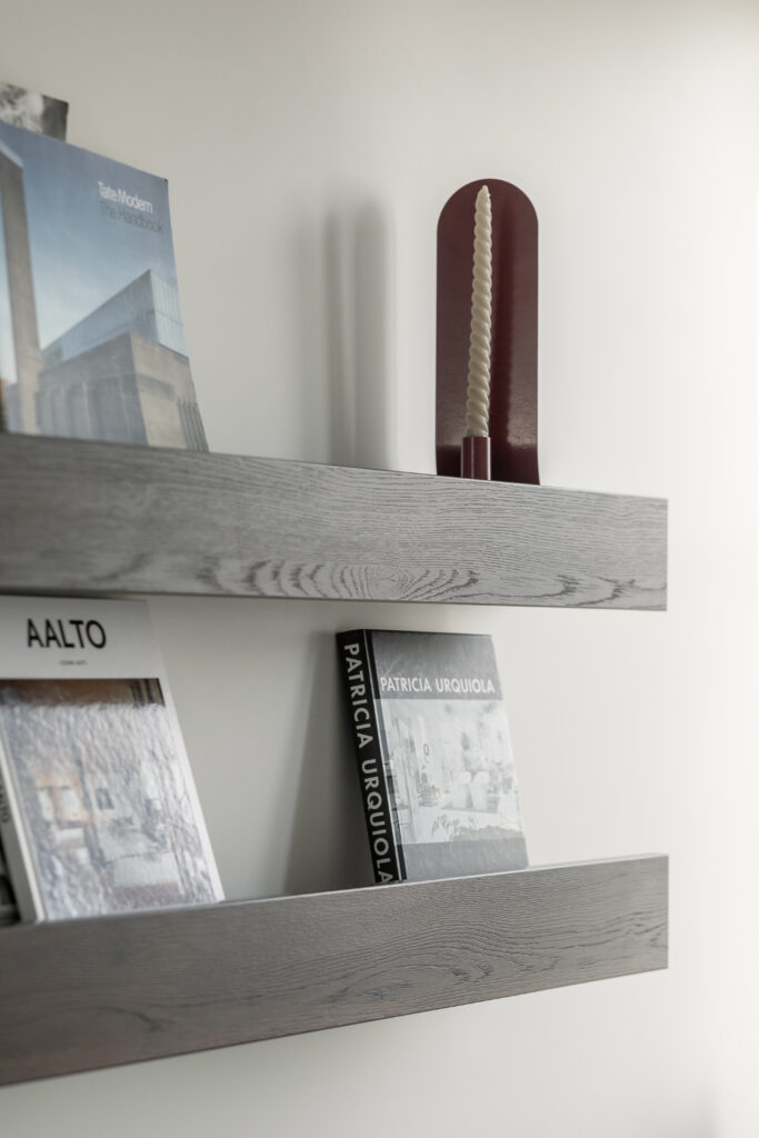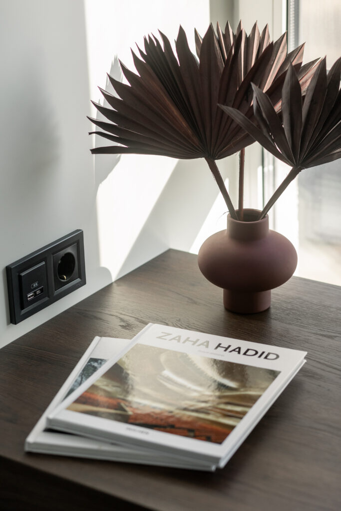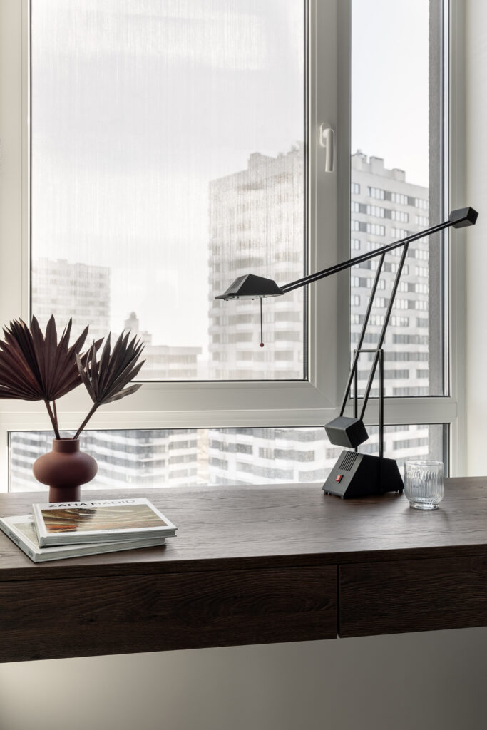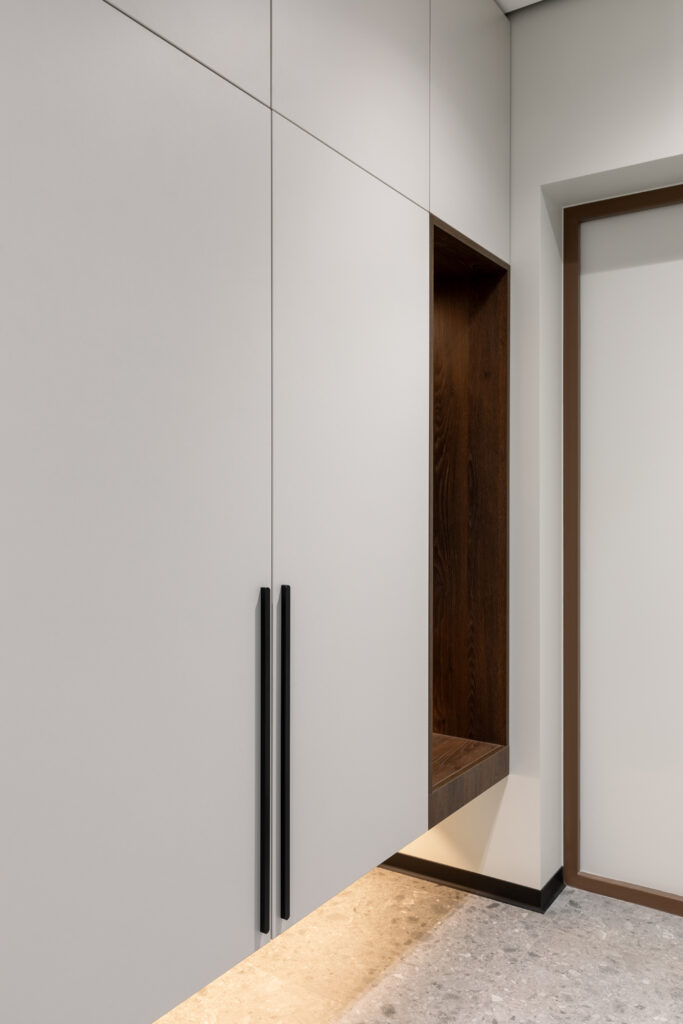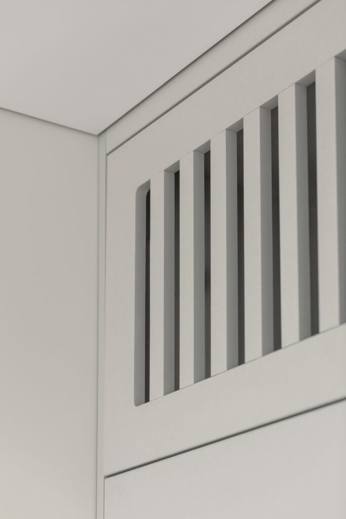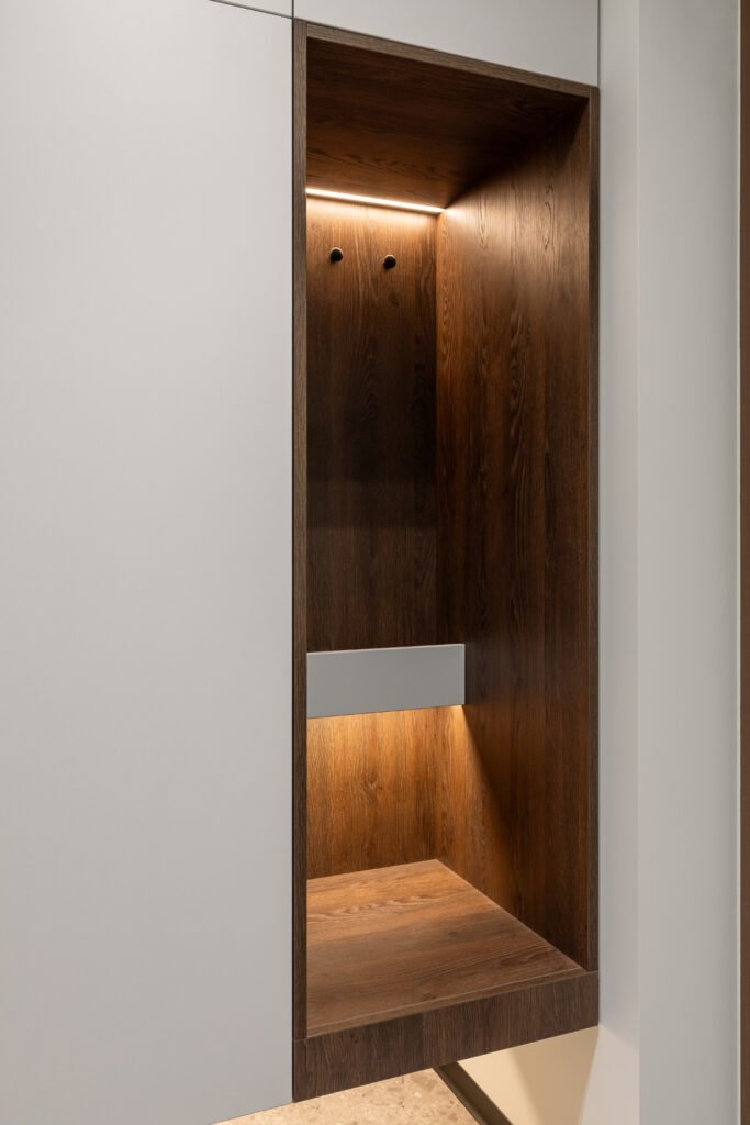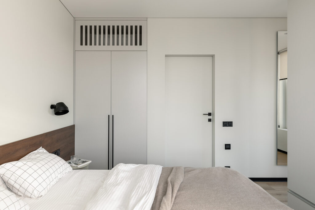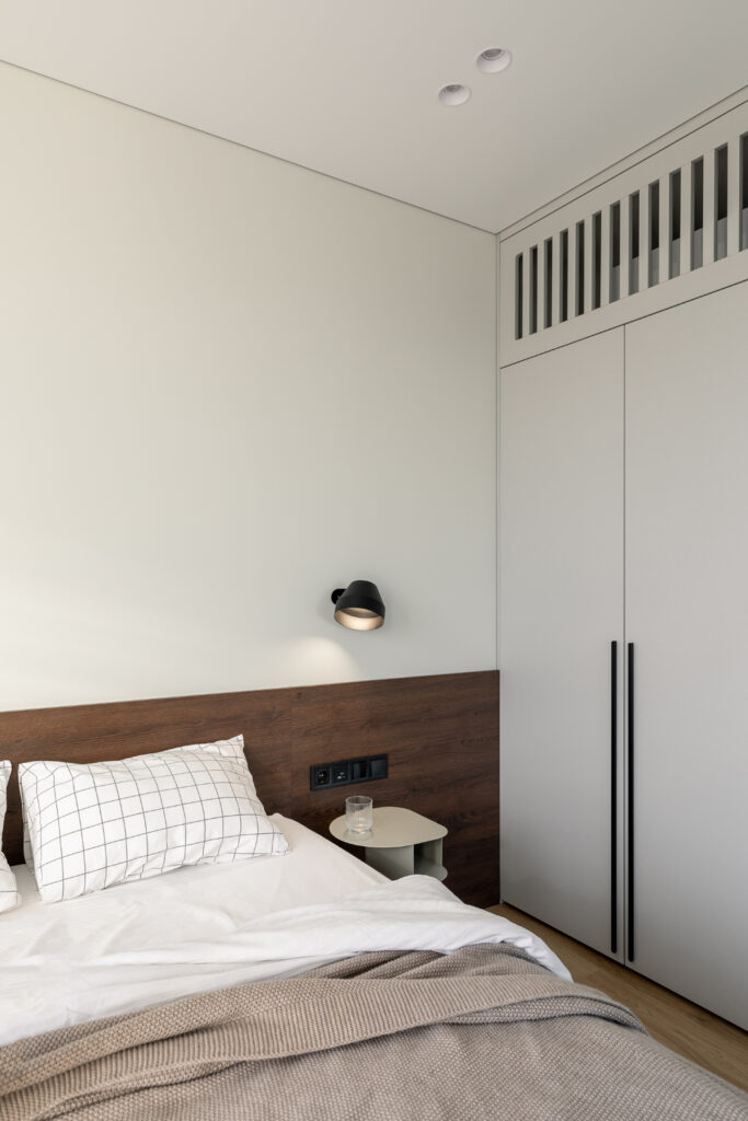 Одним із технічно цікавих елементів стала шафа біля ліжка, в якій ми реалізували вентиляційний фасад, що маскує внутрішній кондиціонер. За фасадами також приховані чотири висувні шухляди для повсякденних речей та одна широка шухляда з прозорим скляним верхом та внутрішнім органайзером — спеціально розроблена для зберігання дрібних особистих аксесуарів: прикрас, ременів, годинників, окулярів.