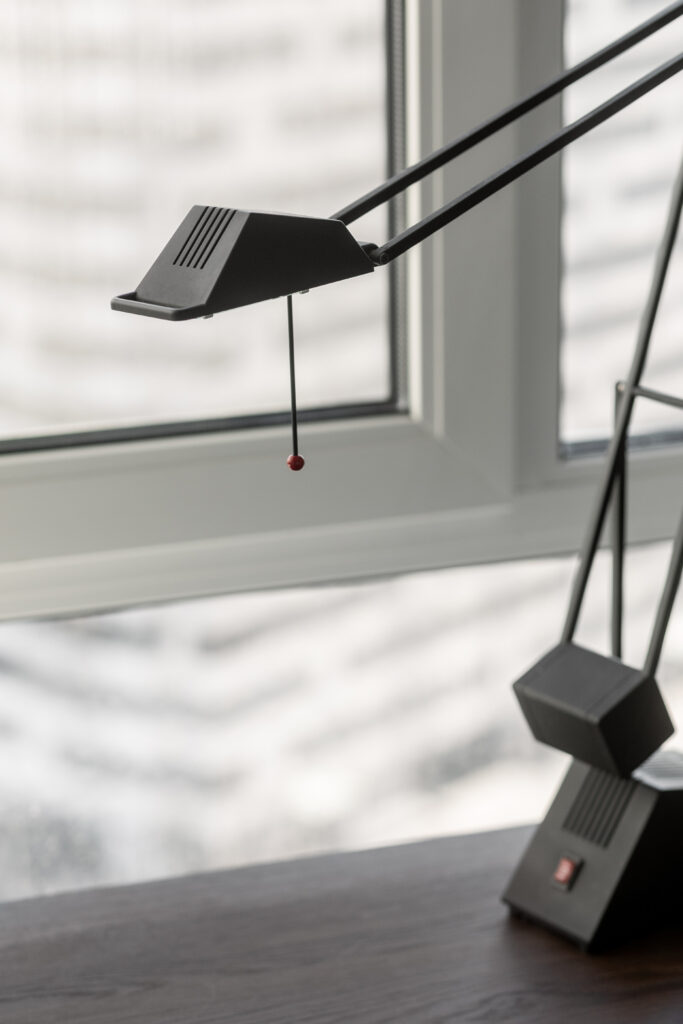 Одним із найоригінальніших рішень стала центральна шафа, яка одночасно виконує функцію розділювача простору між зоною сну та робочою зоною. Її конструкція дозволяє користуватись шафою з обох боків, і вона фактично виконує роль мобільної стіни. Всередині продумано виводи для електроживлення, а також кронштейн для телевізора, що дозволяє використовувати техніку у двох сценаріях — для відпочинку та для роботи.