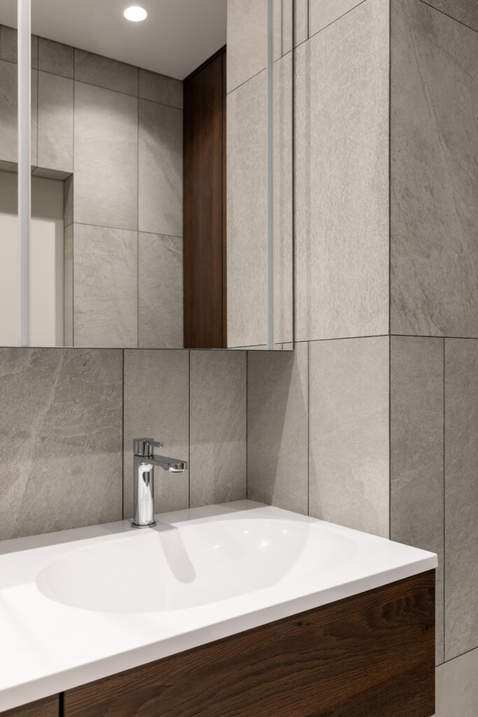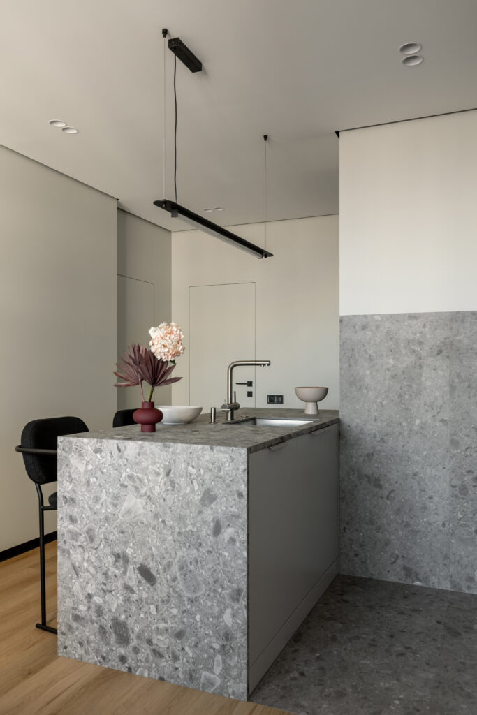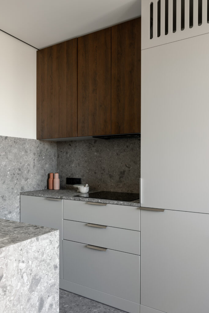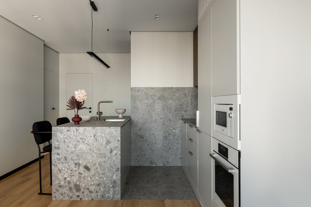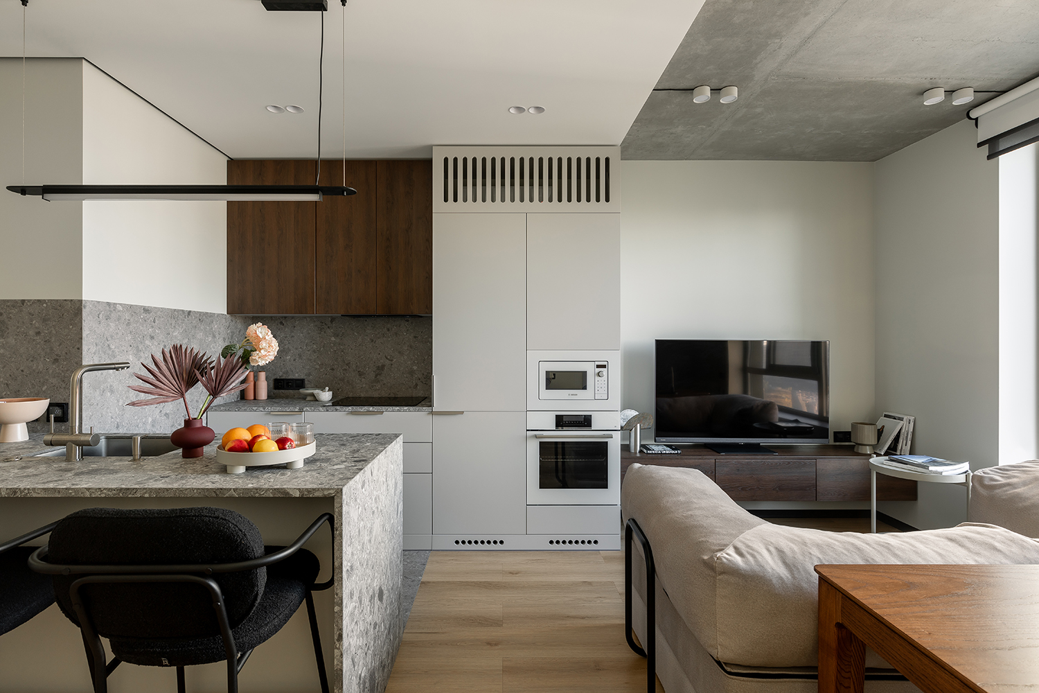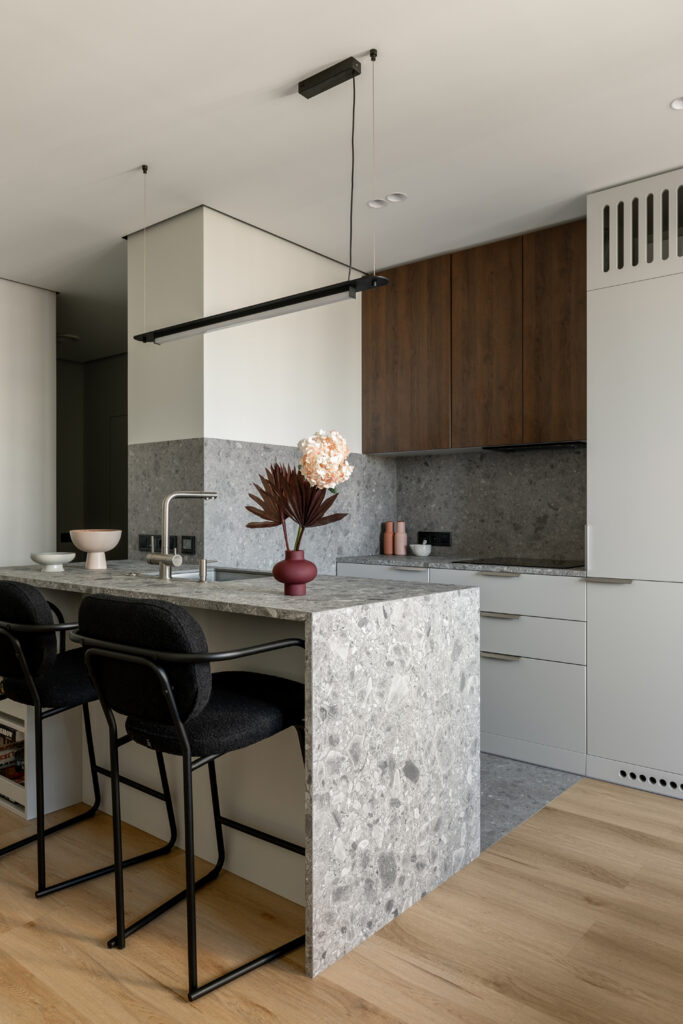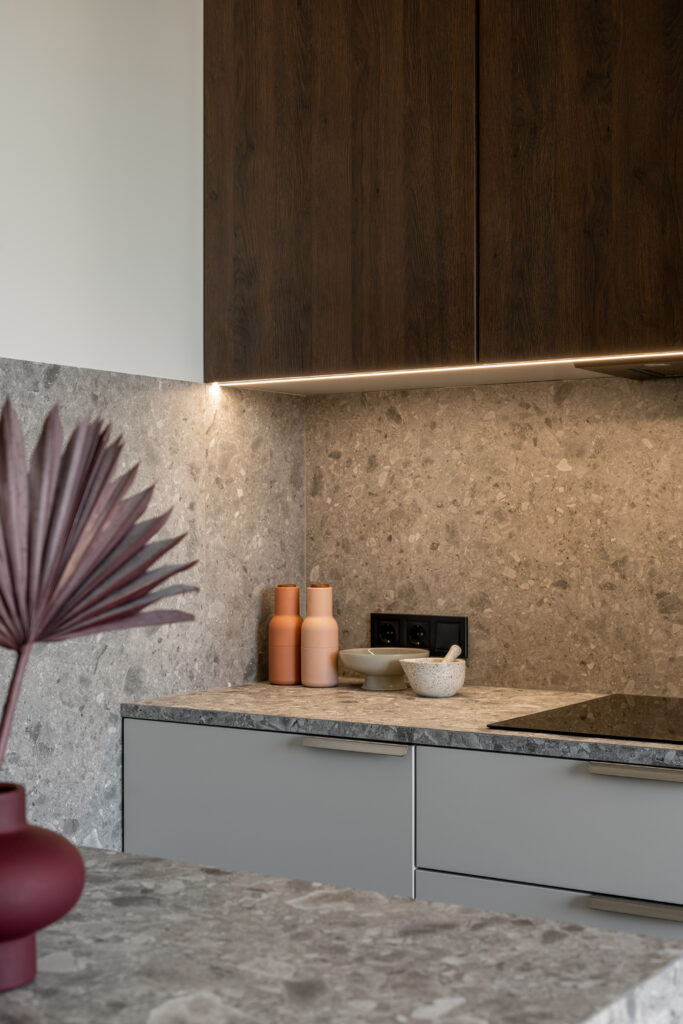 Стільниця, виготовлена з іспанського керамограніту Inalco Iseo Gris, стала акцентним елементом композиції. Вона не лише підкреслює загальний стиль, а й має високі експлуатаційні характеристики: стійка до подряпин, вологи та перепадів температур.
