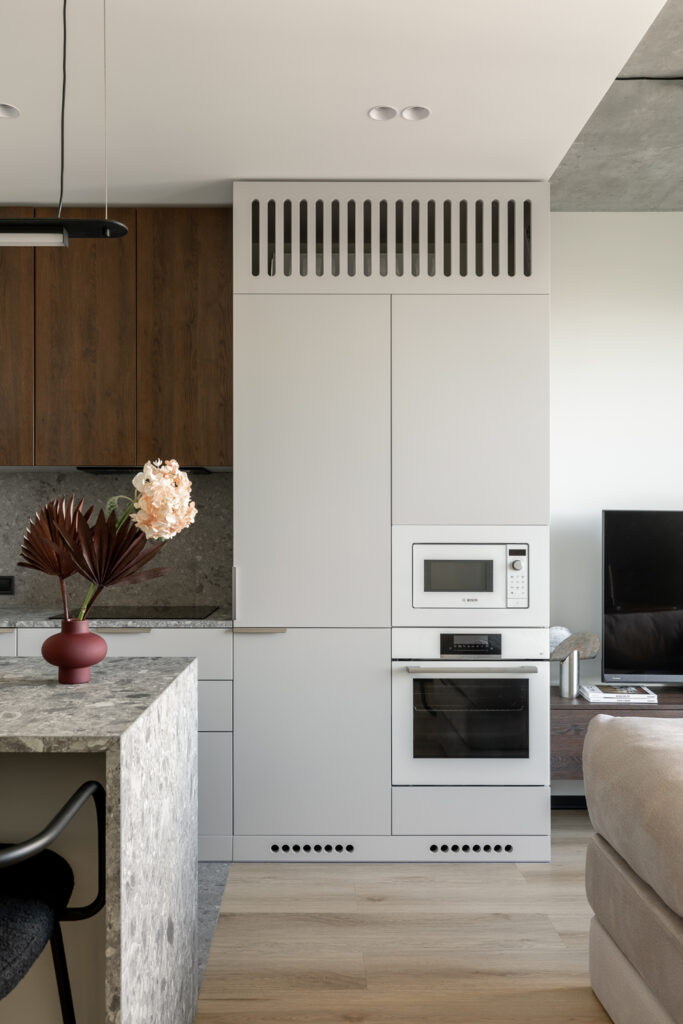Окрему увагу в проєкті заслуговує кухня з островом, яка стала центральним елементом спільного простору. Виготовлена з якісних плитних матеріалів ЛДСП Egger, вона поєднує у собі функціональність і візуальну легкість. Для забезпечення довговічності всі деталі були проклеєні кромкою ABS на водостійкий клей ПУР, що гарантує підвищену стійкість до вологи та температур.