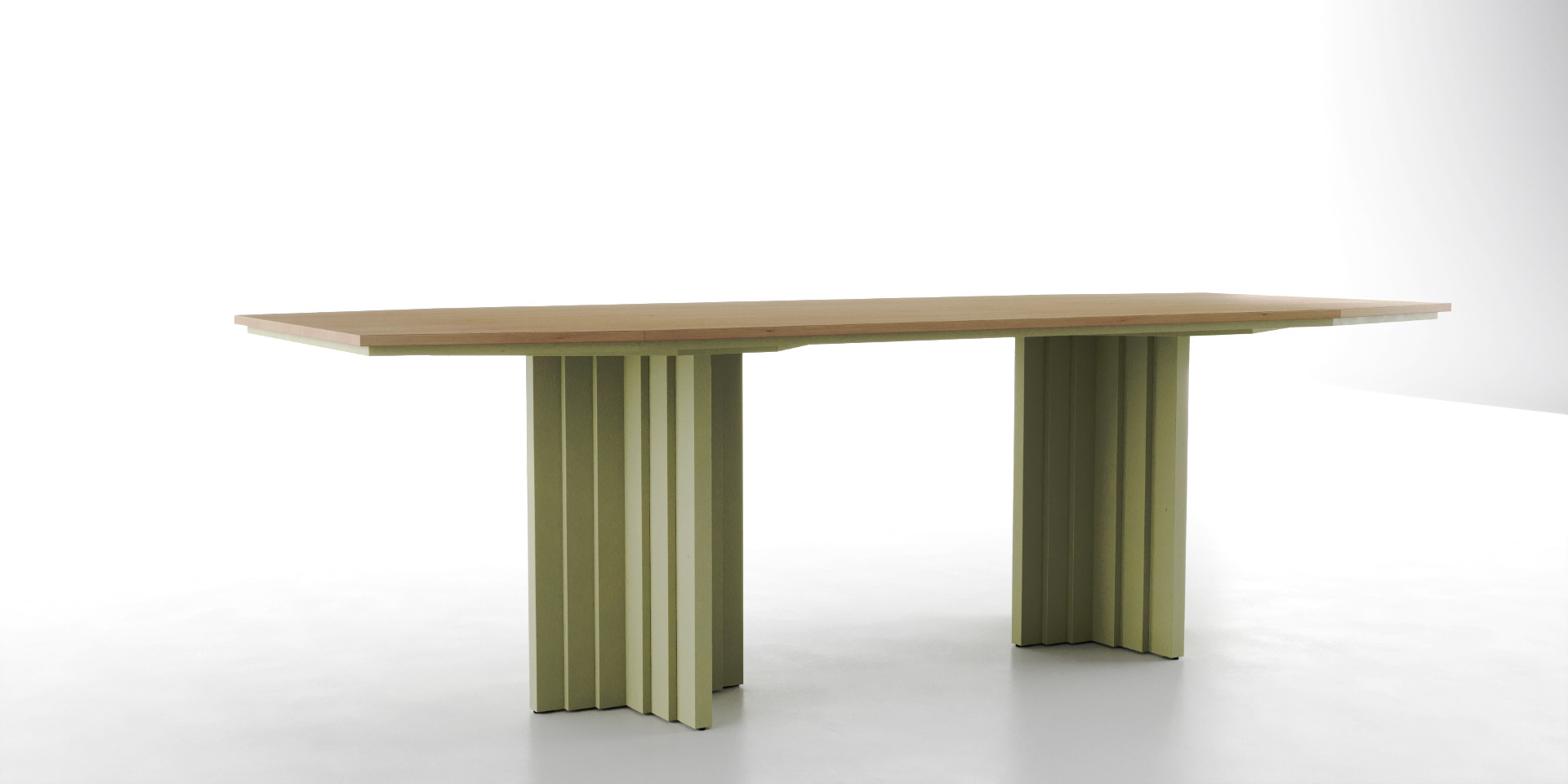 Дві великі хрестоподібні ніжки з сучасного ЛДСП (Kronospan, Egger, Saviola) гарантують надійну стійкість. Їх ритмічна форма створює цікаву гру світла та тіні, додаючи столу характеру. Торці ніжок кромковані ABS кромкою з PUR клеєм, що забезпечує максимальну надійність та захист.